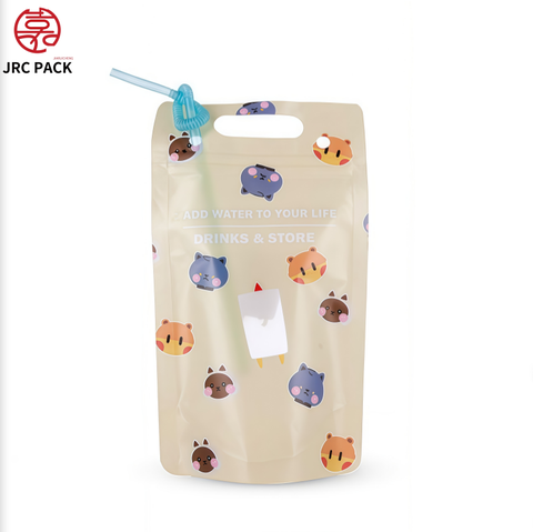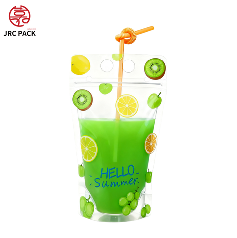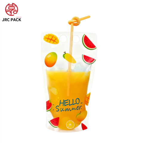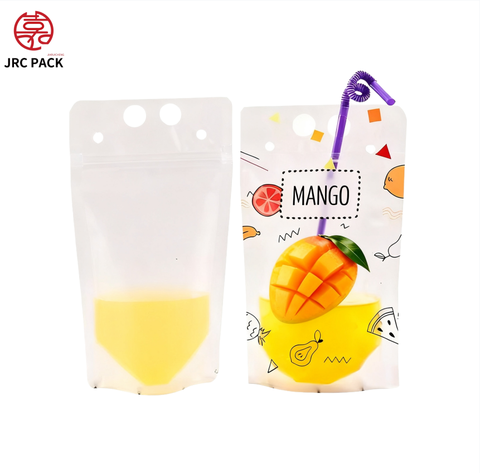 Custom Printed Frosted Plastic Beverage Drink Bags with Handle and Double-Zipper Straw-Included Juice Bags with Stand-Up Feature